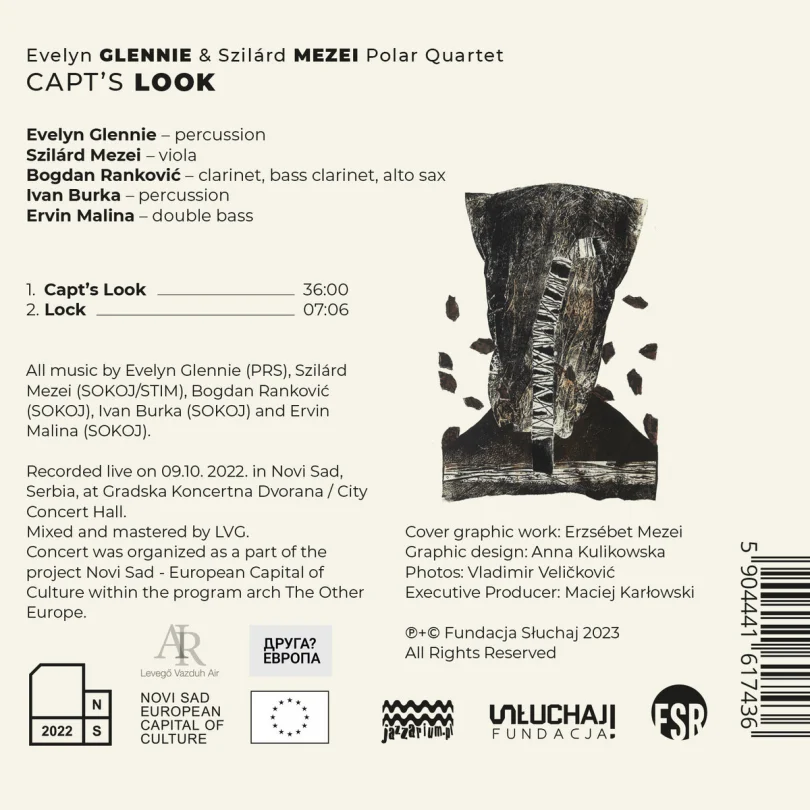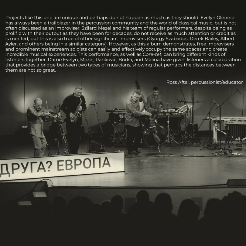 Projects like this one are unique and perhaps do not happen as much as they should. Evelyn Glennie has always been a trailblazer in the percussion community and the world of classical music but is not often discussed as an improviser. Szilard Mezei and his team of regular performers, despite being as prolific with their output as they have been for decades, do not receive as much attention or credit as is merited, but this is also true of other significant improvisers (György Szabados, Derek Bailey, Albert Ayler, and others being in a similar category). However, as this album demonstrates, free improvisers and prominent mainstream soloists can easily and effectively occupy the same spaces and create incredible musical experiences. This performance, as well as Core-tet, can bring different kinds of listeners together. Dame Evelyn, Mezei, Ranković, Burka, and Malina have given listeners a collaboration that provides a bridge between two types of musicians, showing that perhaps the distances between them are not so great.