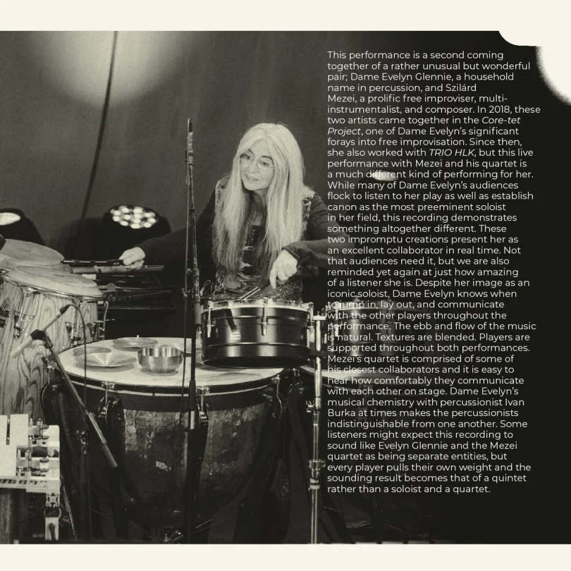 This performance is a second coming together of a rather unusual but wonderful pair; Dame Evelyn Glennie, a household name in percussion, and Szilárd Mezei, a prolific free improviser, multi-instrumentalist, and composer. In 2018, these two artists came together in the Core-tet Project, one of Dame Evelyn’s significant forays into free improvisation. Since then, she also worked with TRIO HLK, but this live performance with Mezei and his quartet is a much different kind of performing for her. While many of Dame Evelyn’s audiences flock to listen to her play as well as establish canon as the most preeminent soloist in her field, this recording demonstrates something altogether different. These two impromptu creations present her as an excellent collaborator in real time. Not that audiences need it, but we are also reminded yet again of just how amazing of a listener she is. Despite her image as an iconic soloist, Dame Evelyn knows when to jump in, layout, and communicate with the other players throughout the performance. The ebb and flow of the music is natural. Textures are blended. Players are supported throughout both performances. Mezei’s quartet is comprised of some of his closest collaborators and it is easy to hear how comfortably they communicate with each other on stage. Dame Evelyn’s musical chemistry with percussionist Ivan Burka at times makes the percussionists indistinguishable from one another. Some listeners might expect this recording to sound like Evelyn Glennie and the Mezei quartet as being separate entities, but every player pulls their own weight and the sounding result becomes that of a quintet rather than a soloist and a quartet.